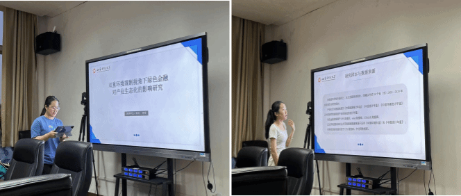 2024年9月11日晚,2024-2025学年第1期学术沙龙活动在吴梦琪同学的主持下如期举行,本次沙龙的主题是“双重环境规制视角下绿色金融对产业生态化的影响研究”,由2023级金融学硕的高凡同学和李雯同学为大家作汇报讲解,本次沙龙有幸邀请到亢一鸣老师和马文婷老师作为讲评嘉宾,参加本次沙龙的是来自2023级各专业的员工。