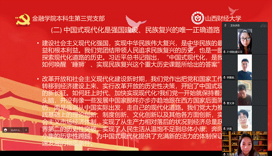 会议伊始,本科生第三党支部预备党员曹文涛以《以中国式现代化全面推进中华民族伟大复兴,坚持以人民为中心》为主题,给支部成员们分享了他的学习心得。首先,预备党员曹文涛讲到:“中国建设的现代化,不是西方化,不是欧美化,是具有中国特色、符合中国实际的。言简意赅、内涵丰富的五条论断,为我国的现代化建设指明了方向。中国共产党正团结带领中国人民深入推进中国式现代 化,努力为人类对现代化道路的探索作出新贡献。”