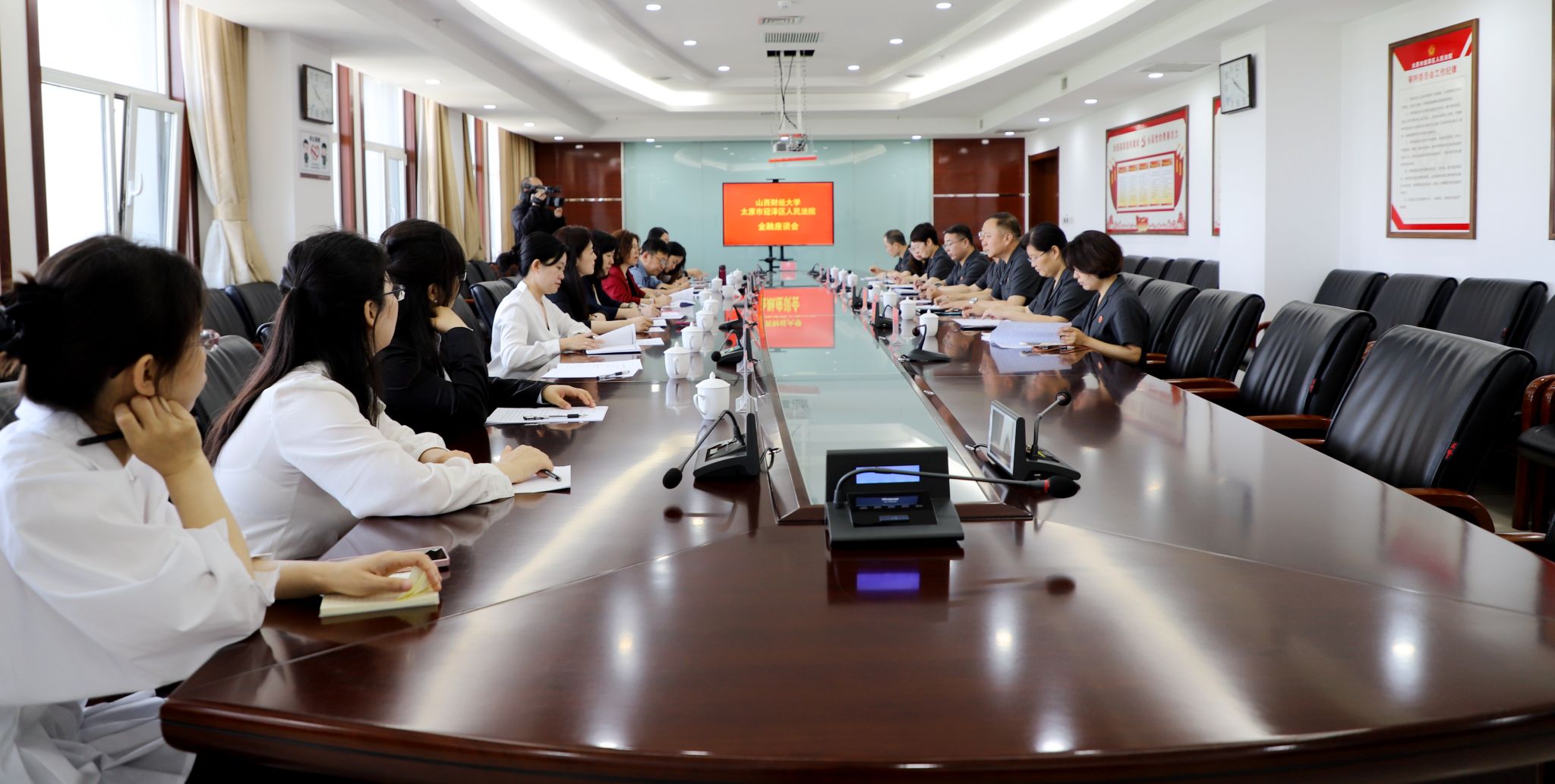 最后,双方在迎泽法院七楼会议室举行了金融座谈会。王钢详细介绍了设立研究基地的背景和目的,展望了法院运用科技平台解决金融纠纷的美好前景,同时指出双方要进一步细化框架协议的各项内容,建立联络机制,鼓励财大师生入驻法院开展具体工作,共同将研究基地做实做好,实实在在运行起来。樊云慧从员工入驻短期实践、院校合作开发课程、发布金融审判白皮书、申报金融审判课题、聘请法官担任校外导师等多角度提出有效共建机制。李静萍从法经济学的视角提出建立金融审判案例库为金融案件审判提供参考,交叉学科研究为金融审判实践提供专业支撑,特别是随着新的金融业态的出现,前端金融监管的研究对于实现诉源治理意义深远。双方人员就推进“双基地”建设,细化机制,落实落地相关举措等进行了深入交流。