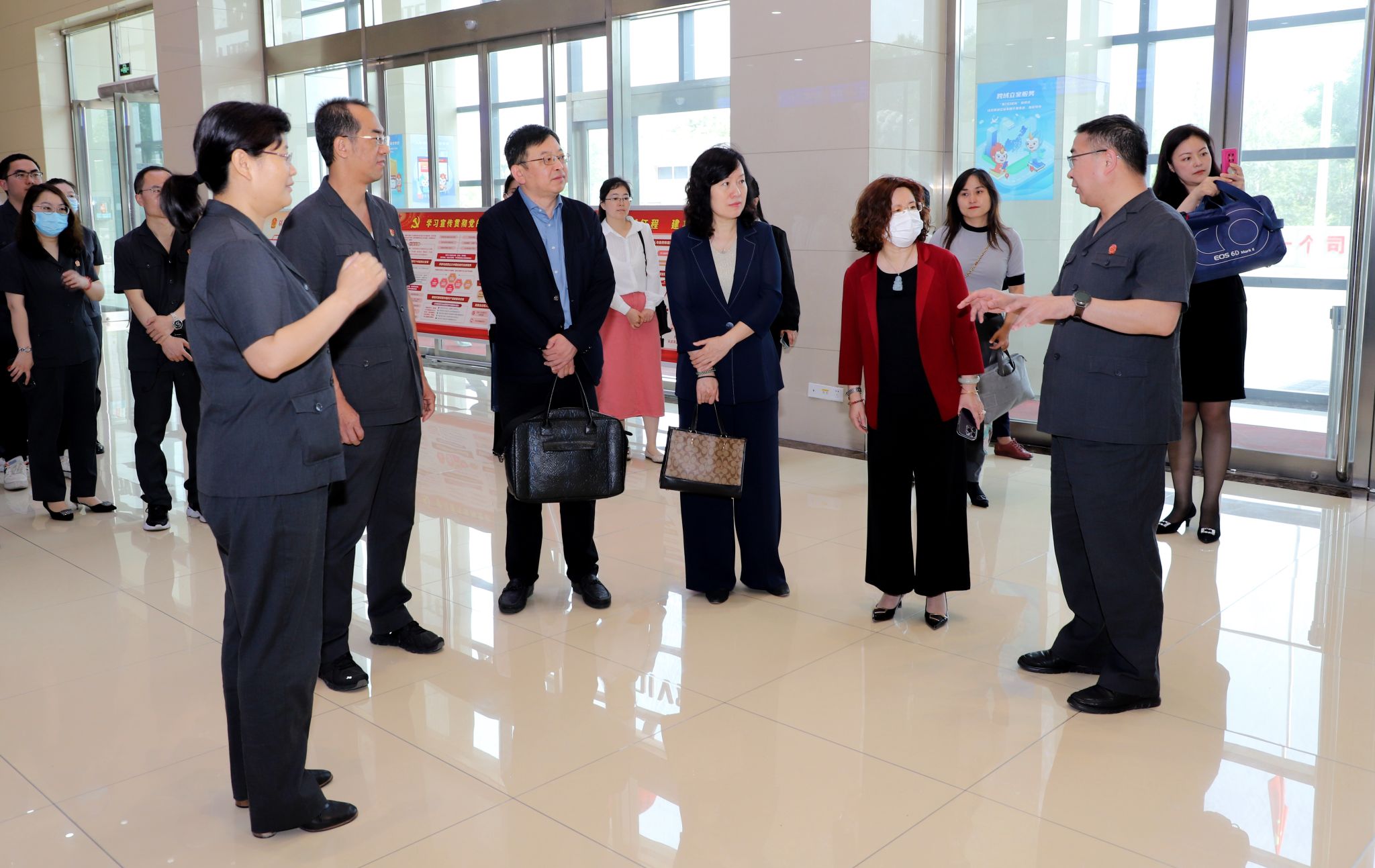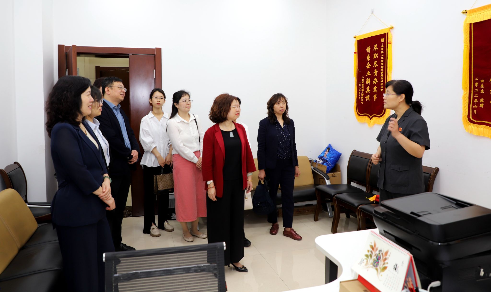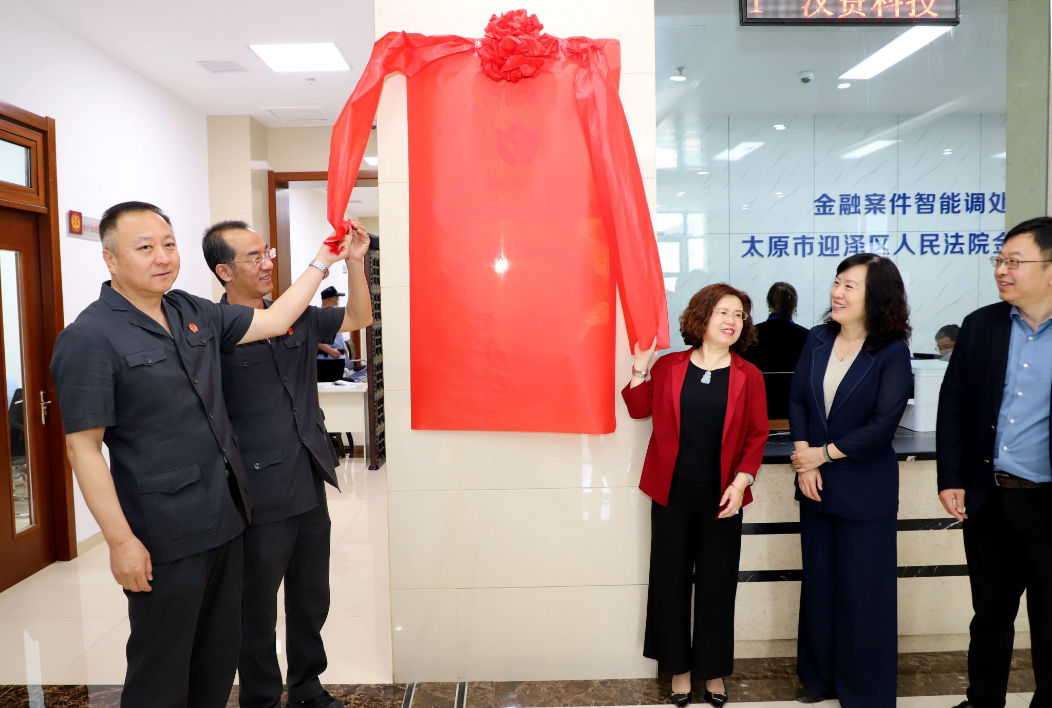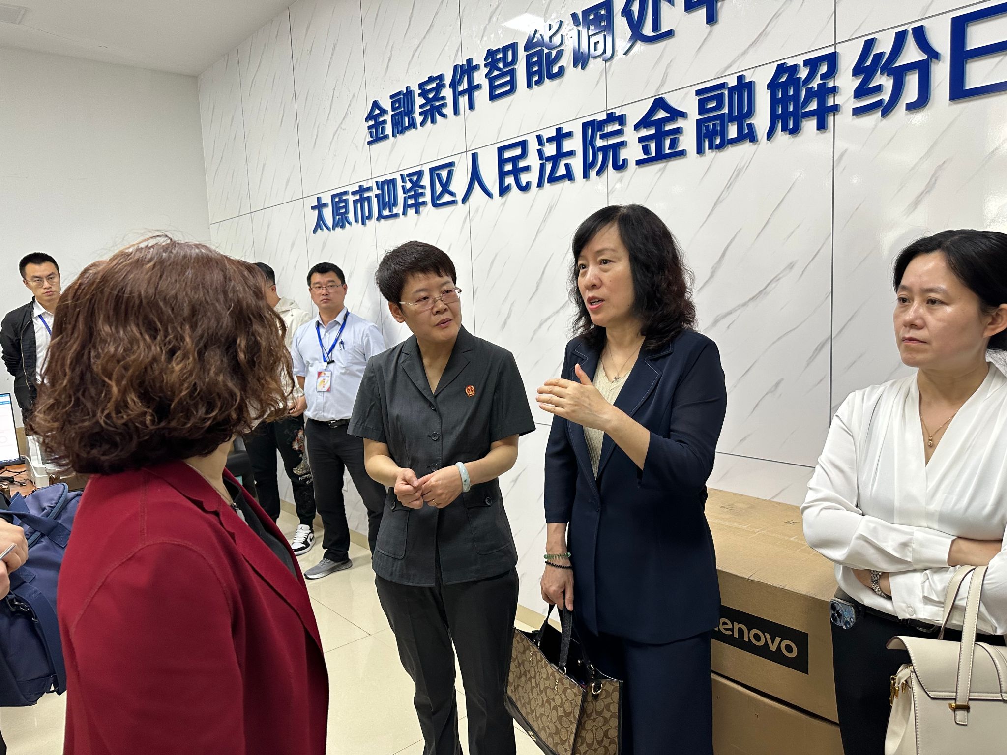 随后财大一行实地参观了迎泽区人民法院诉讼服务大厅、多元解纷区、金融解纷E站(金融案件智能调处中心)以及庭审现场,了解法院诉讼和调解的基本流程和运作机制,并与相关工作人员进行沟通交流。