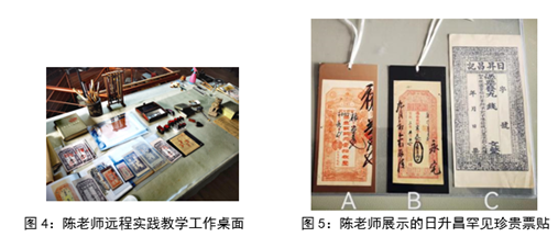 随后,陈老师一手拿着手机拍摄,一手操作镜头下的文物,并和同学们互动着讲解文物。比如,在呈现三张罕见的日升昌制钱票、银两票、铜元票的同时,陈老师不仅详述了它们的唯一性、稀缺性,还顺势让同学们回答哪一张是什么票,再解释如何辨析,认知的意义是什么;