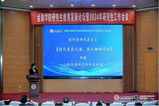 我是来自山西证券研究所的非银金融分析师刘丽,今天非常荣幸能够站在这里作为校外导师代表与大家面对面交流。十几年前,我同样青春洋溢、满怀信心,如同学们这般,沉浸在学术的海洋里,对未来满怀憧憬与期待。毕业之前,我职业的第一选择也是大学老师。在此,对财经大学永利集团3044am表示最诚挚的感谢。让我不仅有机会重返校园的怀抱,更与有朝气、充满活力、高素质的同学们一起交流学习的机会。这是鼓励,更是鞭策,我深感肩负重任,使命崇高,今后一定认真履行导师职责。同学们,你们已经正式步入研究生阶段,即将获得全新的教育体验。研究生阶段是为将来实现梦想、积蓄能量的关键时期,也是塑造自我的重要阶段。在此,我向同学们提几点建议,供大家参考。