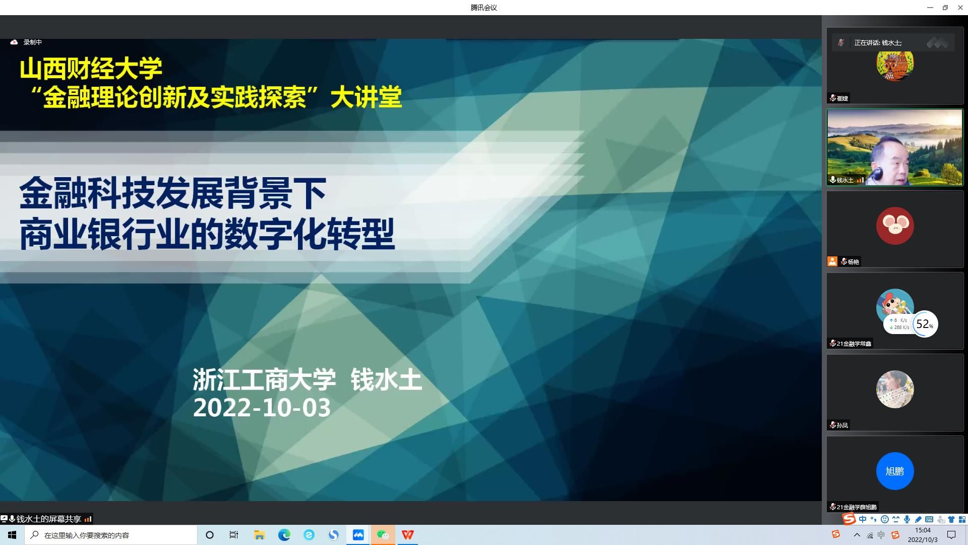 2022年10月3日下午3:00,永利集团3044am应用经济学科办公室、永利集团3044am特邀浙江工商大学二级教授、MBA公司经理、浙江金融改革发展研究院经理、浙江之江创投研究院经理的钱水土教授,为公司师生作了题为《金融科技发展背景下商业银行的数字化转型》的讲座,因疫情原因,讲座采用腾讯会议线上方式举行。公司教职工、部分其他公司的教师及研究生一百余人聆听了本场讲座。